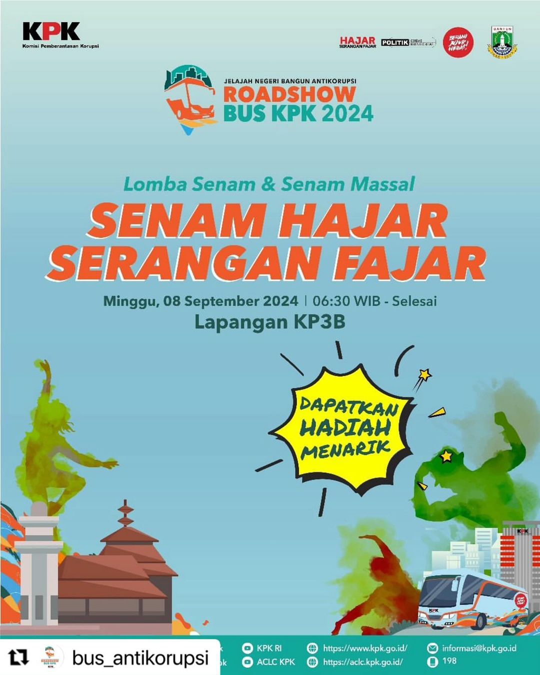 Roadshow Bus KPK 2024 mengajakmu bersenang-senang dan olahraga pada kegiatan Senam Massal dan Lomba senam Hajar Serangan Fajar pada hari Minggu, 08 September 2024 pukul 06.30 WIB di Lapangan KP3B.
