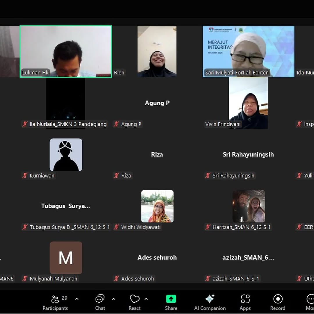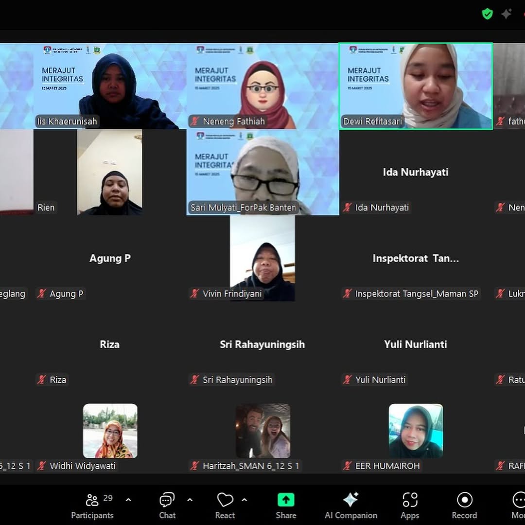 Sabtu, 16 Maret 2025. Melalu media zoom meeting Hj. Ratu Syafitri Sekretaris Inspektorat Daerah Provinsi Banten Selaku Ketua ForPAK Banten melakukan Opening Speech pada kegiatan Merajut Integritas Vol. 2 dengan tema : " GRATIFIKASI AKAR KORUPSI "