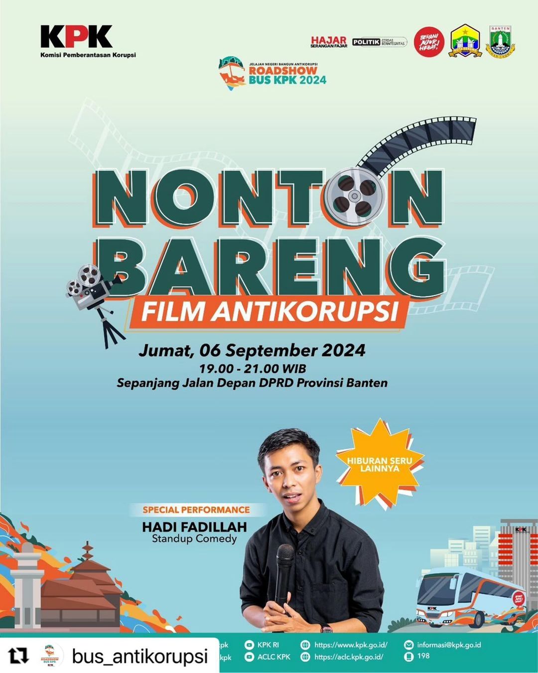 Jangan lewatkan kegiatan Nonton Bareng Film Antikorupsi dan saksikan Band Hiburan, Special Performance Hadi Fadillah yang merupakan seorang Stand up Comedy dan Hadiah menarik. Gratiss!!! Jangan sampai ketinggalan yaa!
