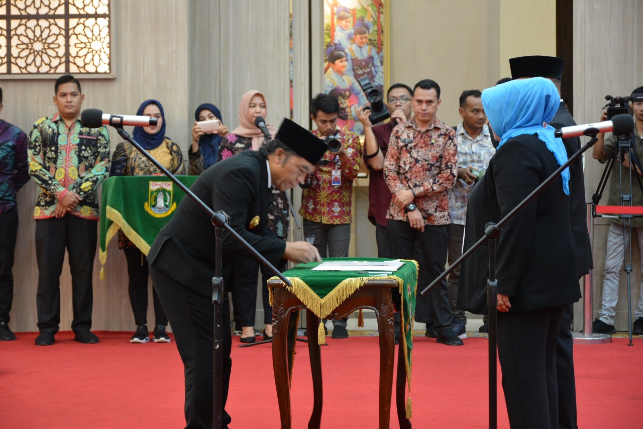 Penjabat (Pj) Gubernur Banten Al Muktabar mengukuhkan Suyarsih Fifi Herwati sebagai Kepala Perwakilan Badan Pengawasan Keuangan dan Pembangunan (BPKP) Provinsi Banten di Pendopo Gubernur Banten, KP3B Curug, Kota Serang pada Jumat (12/1/2024). Perwakilan BPKP sebagai penguatan Aparat Pengawas Internal Pemerintah (APIP) Pemerintah Provinsi Banten dalam pencegahan korupsi.