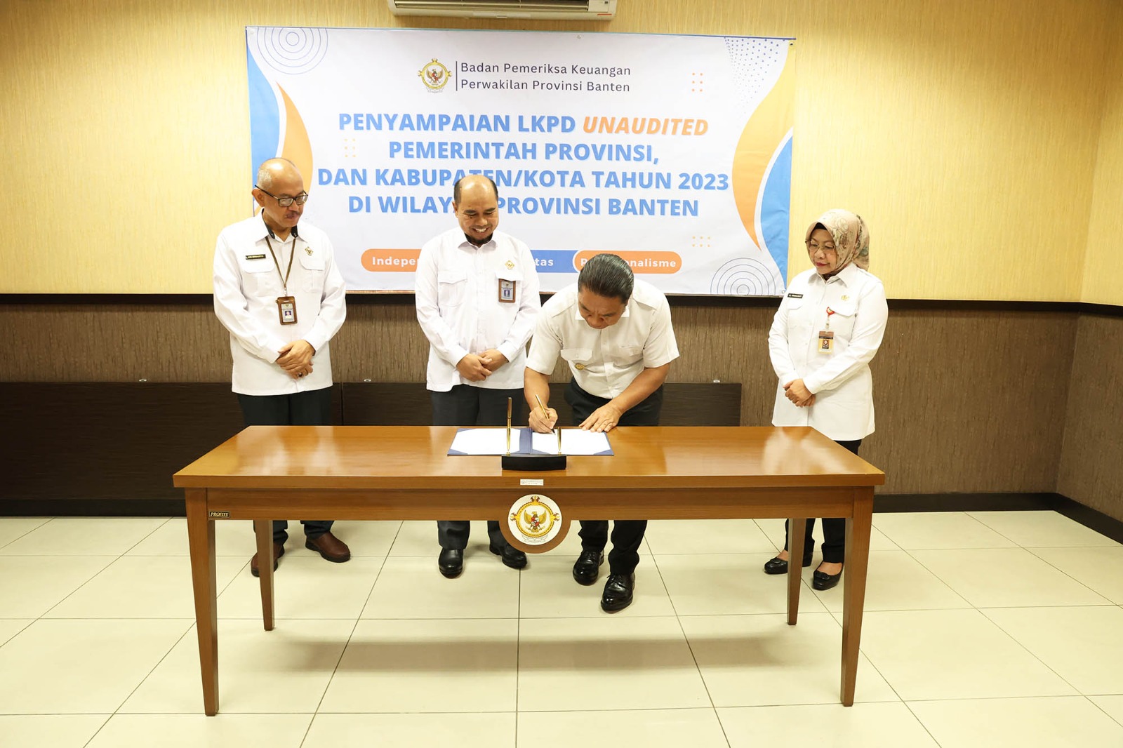 Kepala BPK-RI Perwakilan Provinsi Banten Dede Sukarjo, S.E., M.M., Ak., CA., CSFA., CFrA menerima Laporan Keuangan (LK) Unaudited Pemerintah Provinsi Banten Tahun Anggaran 2023 yang diserahkan langsung oleh Pejabat Penjabat (Pj) Gubernur Banten Al Muktabar didampingi Penjabat (Pj) Sekda Banten, Virgojanti dan Kepala BPKAD Banten, Dr.Hj. Rina Dewiyanti, SE, M.Si.