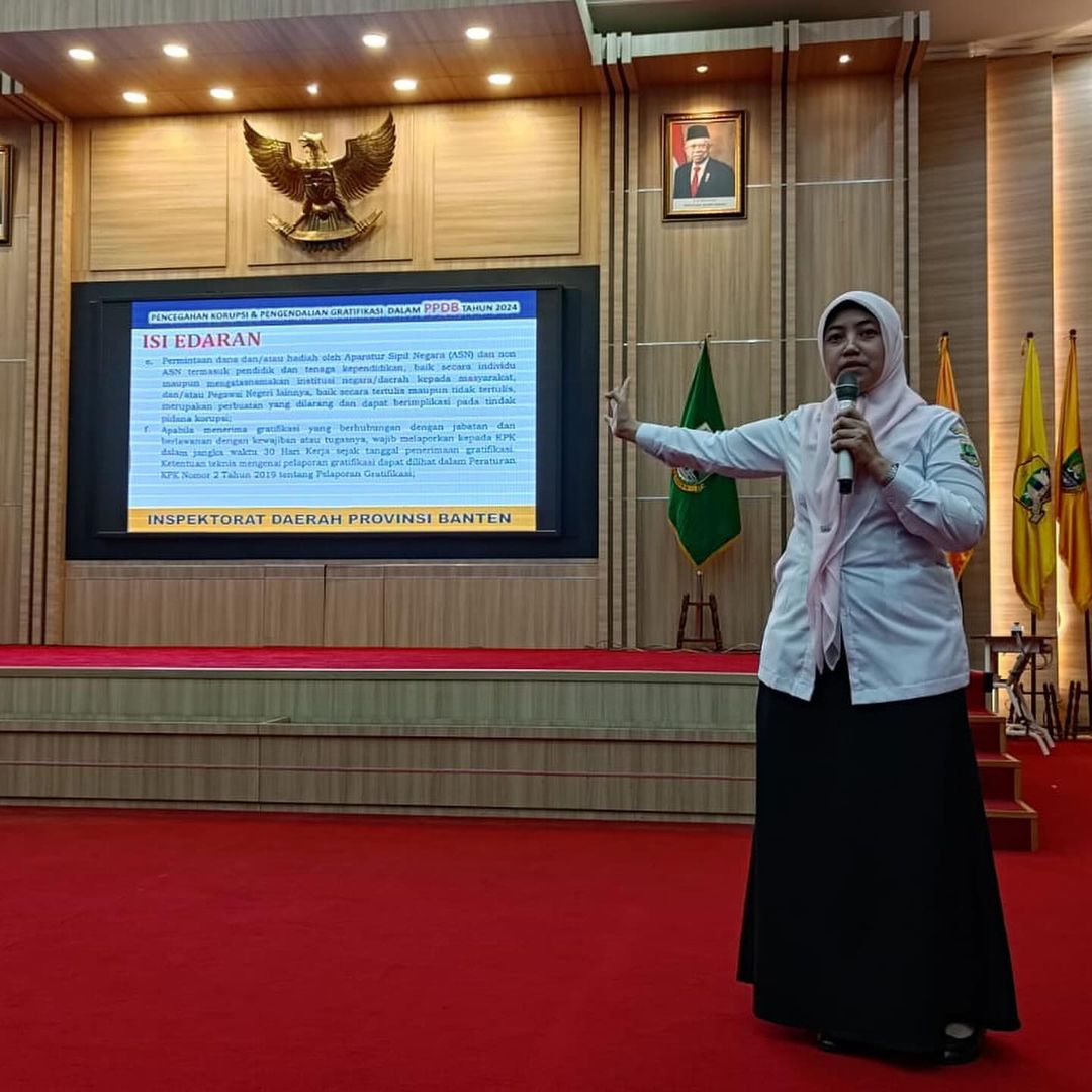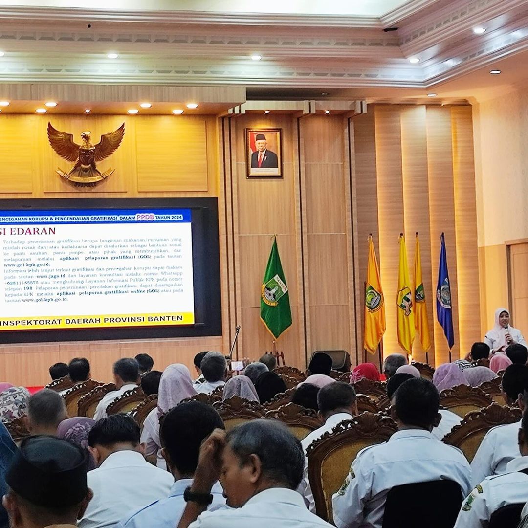 Sosialisasi SE KPK RI perihal Pencegahan Korupsi dan Pengendalian Gratifikasi dalam PPDB 2024 kepada Kepala Sekolah SMA SMK SKH Negeri, Pengawas Sekolah dan KCD di Lingkungan Dinas Pendidikan dan Kebudayaan Provinsi Banten, Rabu 12 Juni 2024 Pendopo Gubernur KP3B Palima Serang