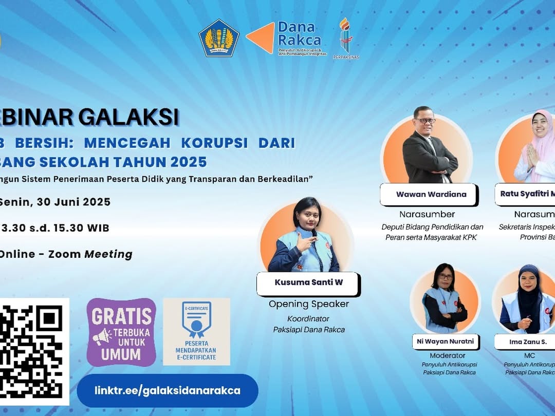 Paksiapi Dana Rakca mengajak kamu untuk ikut serta dalam gerakan pendidikan antikorupsi sejak dini melalui webinar GALAKSI edisi spesial ini.