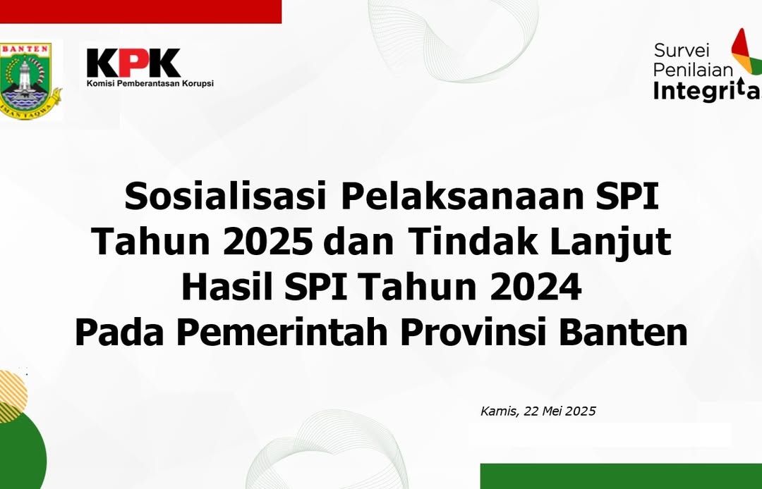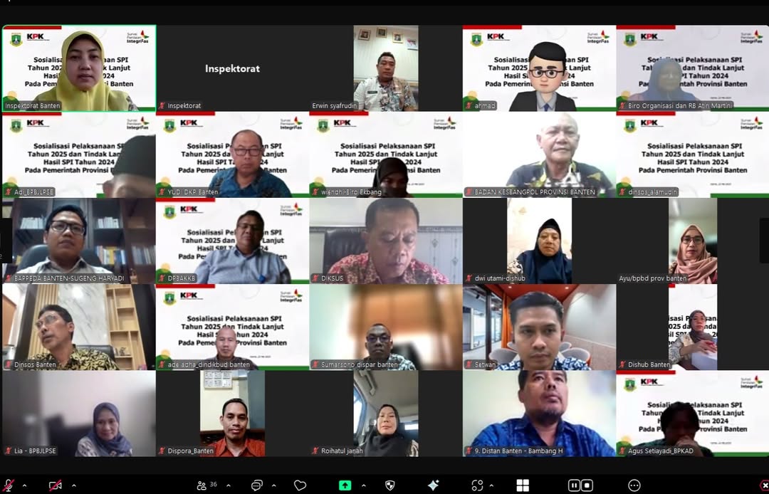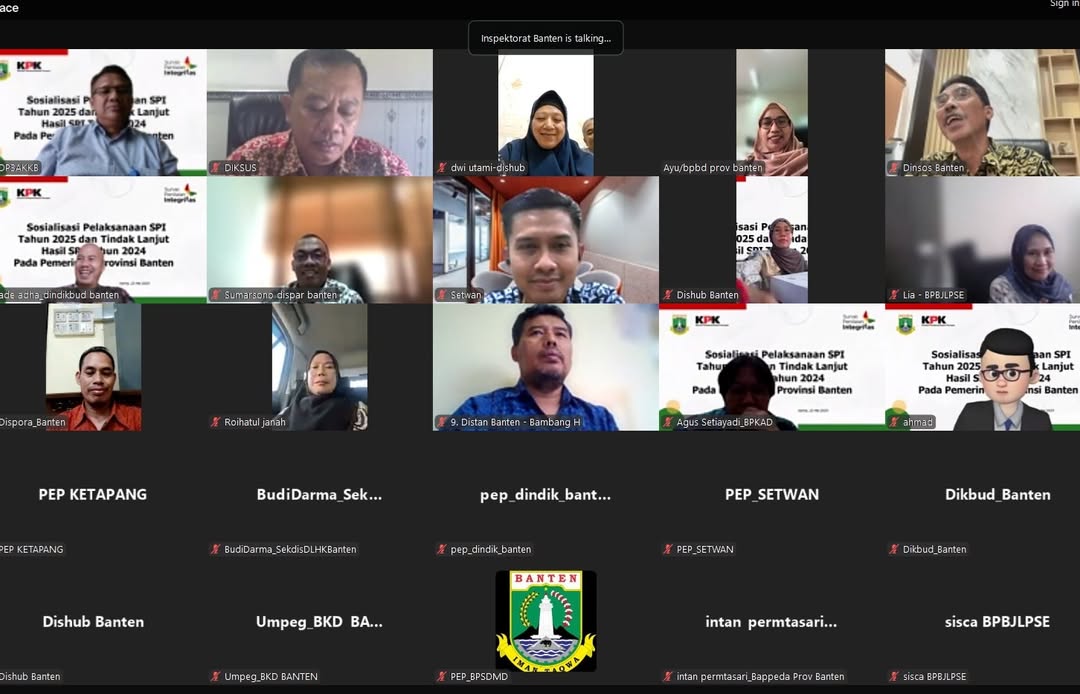 Inspektorat Daerah Provinsi Banten mengundang seluruh Organisasi Perangkat Daerah (OPD) di lingkungan Pemerintah Provinsi Banten untuk mengikuti Zoom Meeting Sosialisasi Pelaksanaan Survei Penilaian Integritas (SPI) Tahun 2025 serta Tindak Lanjut Hasil SPI Tahun 2024.